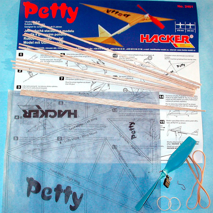Velmi jednoduchá stavebnice volně létající ho modelu s gumovým pohonem pro malé modeláře od 8 let.