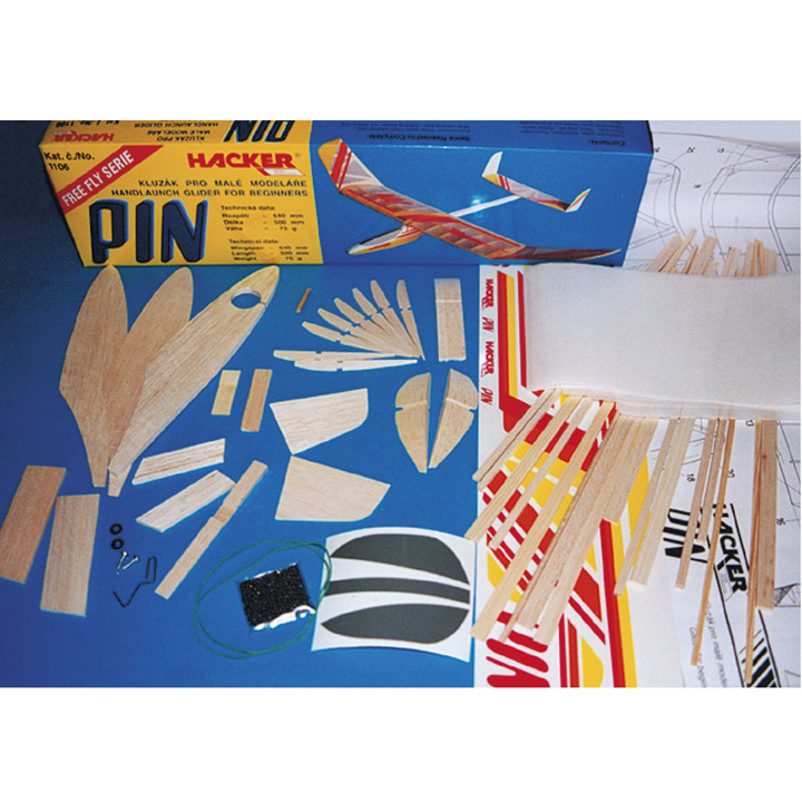 Stavebnice modelu kluzáku pro začínající modeláře. PIN je stavebně nenáročný vzhledem k vysoké předpracovanosti všech dílů staveb nice, takže jeho stav bu zvládne i úplný začátečník.