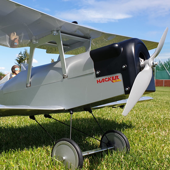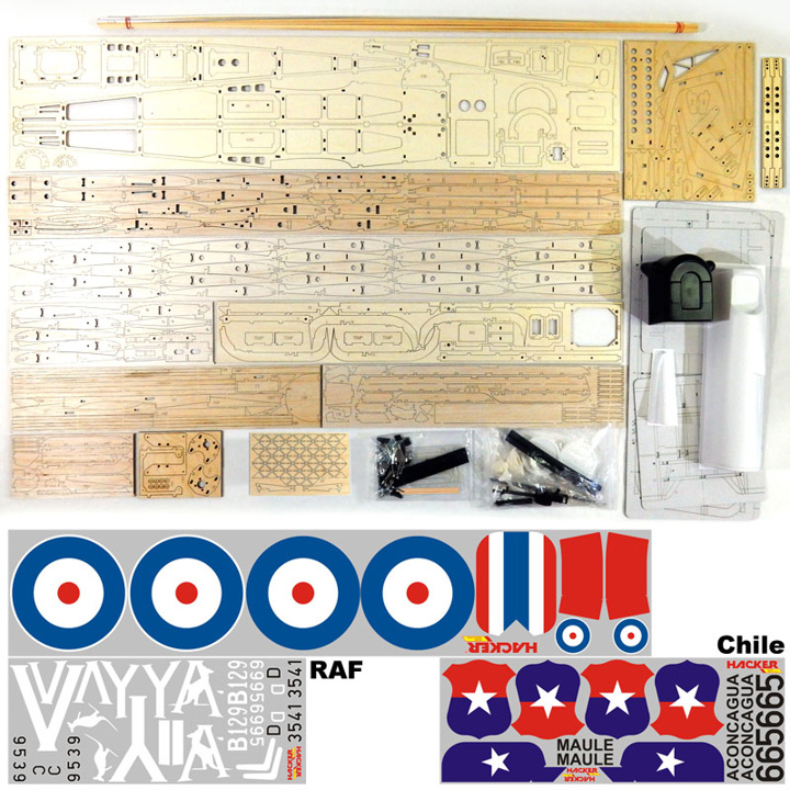 Min 5-kanálovou RC soupravu, prodlužovací servokabely 2× 150–200 mm kat.č. HC4480 a 2× 300 mm kat.č. HC4483, 4 serva 9–15 g MF A-1109MG kat.č. HC4310, servo 9–15 g MF A-1109HB kat.č. HC4301, 4-taktní motor 5 ccm (ASP, Saito, OSMax) s příslušenstvím, nádrž 170 ml, přijímačovou baterii, vrtuli APC 10/4" (pro spalovací motor).