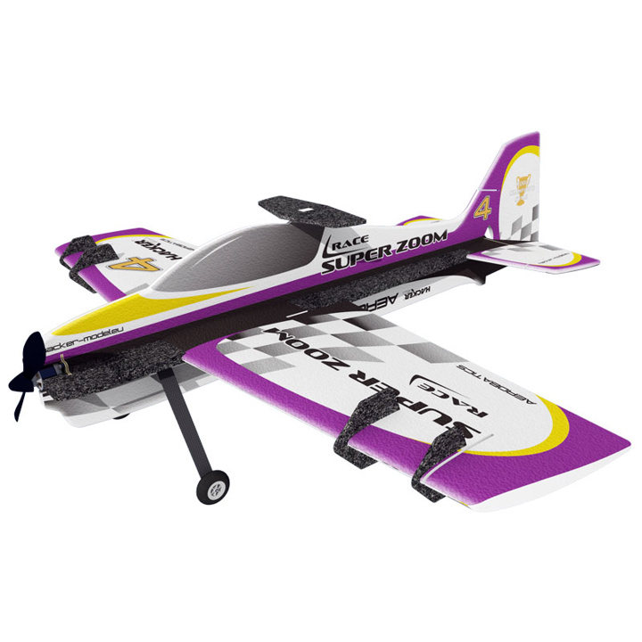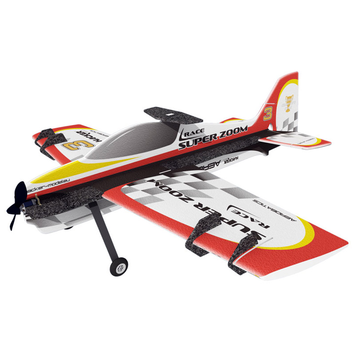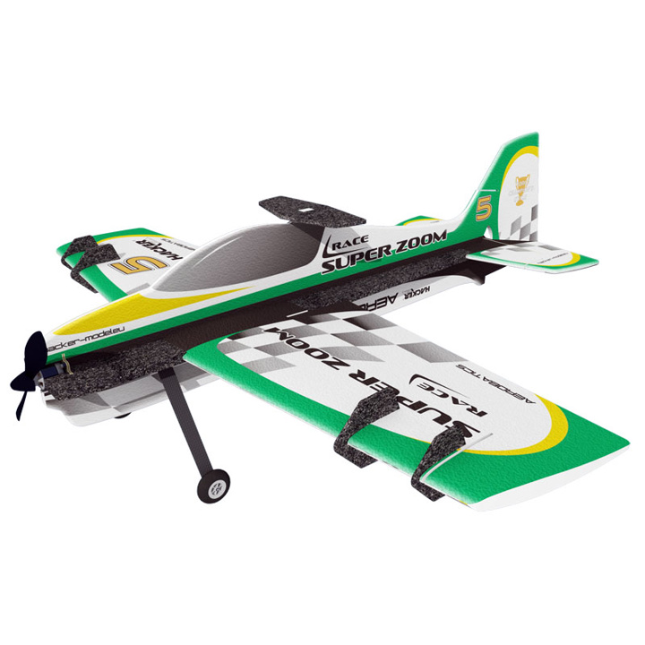 Oblíbený akrobatický model v nové verzi v atraktivních barevných variantách s větší plochou křidélek, větší boční plochou trupu a generátory bočního vztlaku (SFG). Koncepce "shock", křídlo se symetrickým profilem a celková geometrie modelu dělají ze Super Zooma Race výkonný model pro létání extrémní akrobacie. Hlavní díly modelu jsou vyrobeny z expandovaného polypropylenu (EPP), který zajišťuje výbornou odolnost modelu jak při létání tak při drobných karambolech. Model je vybaven podvozkem z uhlíkových a skelných vláken. Budete potřebovat: 4 kanálovou RC soupravu např. FLYSKY FSI6 - kat.č.HC4101, 4 mikroserva 9g kat.č. HC4301, pohonný set kat.č.HC3536R nebo (elektromotor M FORCE 2826CA-15 kat.č. HC3506, regulátor MC-22A kat.č. HC3370) , pohonnou baterii LiPol 3S 610 až 1300mAh, kužel 28 mm kat.č. HC5320, vrtuli 9/4,7"-10/4,7", řídké vteřinové lepidlo s aktivátorem.